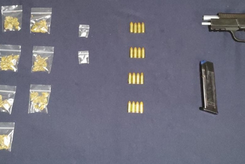El conductor del automotor se identificó como Jesús “N”, a quien se le encontró en posesión de 11 bolsitas de plástico con hierba verde similar a la marihuana, un arma de fuego con 16 cartuchos útiles y un teléfono celular, mientras que la copiloto, identificada como  Marlen “N”, se le encontró una bolsita de plástico con hierba verde y seca similar a la marihuana.