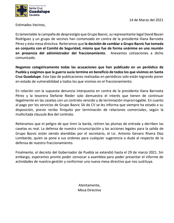 En domingo por la tarde, mediante un comunicado sin firma, los colonos del fraccionamiento Santa Cruz Guadalupe vieron extenderse la ola de atropellos y abusos que han caracterizado la gestión de una mesa directiva aferrada al manejo opaco de las cuotas.